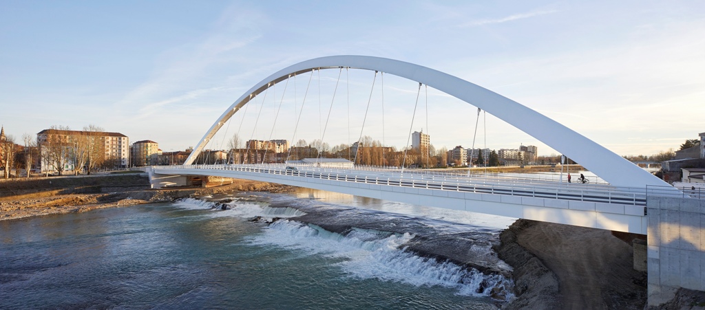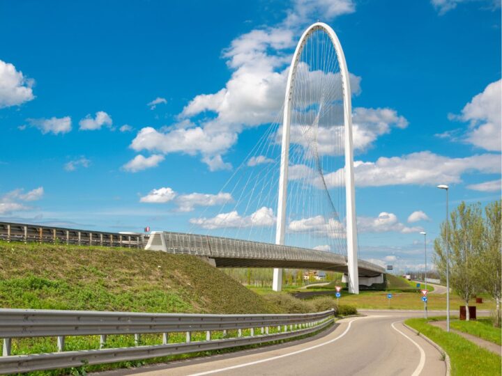 In Italia sono sempre più numerosi e spesso portano la firma di famosi archistar, come Santiago Calatrava che con le sue “vele” ha contribuito al processo di riqualificazione urbana della parte settentrionale della città di Reggio Emilia. Sono tre i ponti da lui progettati (uno di scavalcamento e gli altri due laterali), che appaiono come sospesi nel paesaggio piatto della pianura padana, in cui si fondono forza strutturale ed effetto scenografico. Un trionfo di acciaio e cemento armato. Protagonista assoluto: il bianco, che esalta la purezza del disegno, l’eleganza delle sue linee e l’intera sagoma in acciaio. Si lasciano ammirare dall’autostrada, o dalla stazione ferroviaria dell’alta velocità e sono ancora più belli alla sera grazie all’illuminazione alimentata con energia pulita, originata da fonti rinnovabili. Verde, bianco e rosso sono i colori, a ricordare la bandiera italiana.