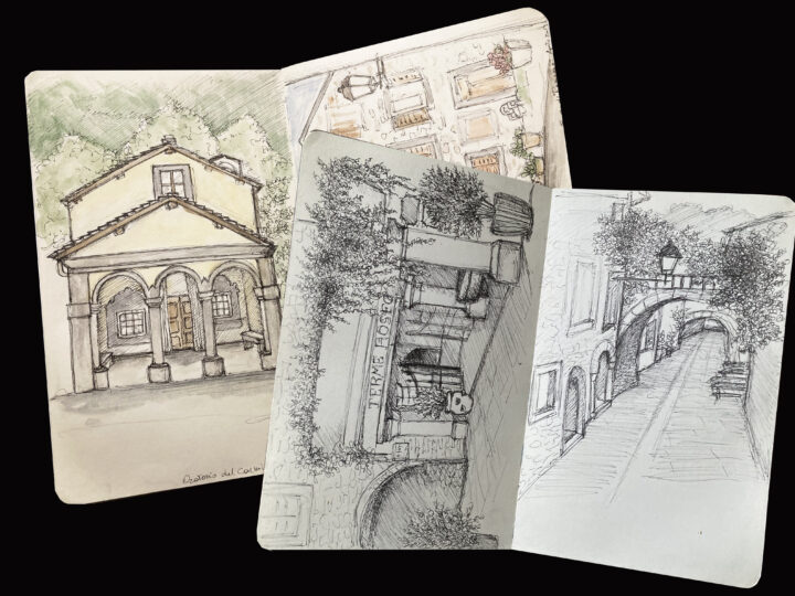 Si inizia così e piano piano si affiancano piccoli segni, abbozzi e lasciando che la mano si muova liberamente, il disegno appare; riguardandolo dopo un po’ di tempo ci riporterà nel luogo e nel ricordo che rappresenta.