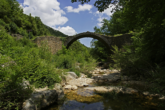 Una costruzione antichissima. Basti pensare che da qui passava, ai tempi degli Etruschi, la via di collegamento tra la Val di Merse e la Maremma. La leggenda, racconta che in prossimità di questo luogo e durante le notti senza luna, si veda aggirarsi il fantasma di una donna, un’entità bianca e luminosa con il volto coperto da un velo che cammina sul Ponte senza toccare la terra. Leggenda a parte, diverse le tesi su chi possa essere questa donna; gli unici elementi in comune, tra le varie teorie, parlano di una dama senese chiamata Pia, vittima innocente di intrighi amorosi. La più accreditata è che possa essere Pia de’ Tolomei, fatta uccidere a Castel di Pietra dal marito, Nello d’Inghiramo de’ Pannocchieschi, per accuse di infedeltà. Dante la cita nel Canto V del Purgatorio (versetti 130-136) «Deh, quando tu sarai tornato al mondo, e riposato de la lunga via, seguitò il terzo spirito al secondo, ricorditi di me che son la Pia; Siena mi fé; disfecemi Maremma: salsi colui che inanellata pria, disposando m’avea con la sua gemma».